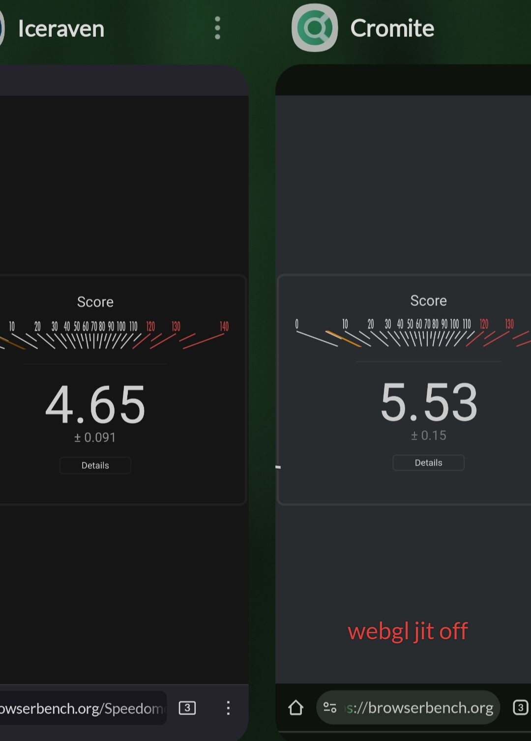 Nothing changed results. JIT, webrender etc… it’s indeed so complex that I can’t compare all settings but I’ve checked basic things and see they are the same they do not do the same. Iceraven in Speedometer test, and in everyday usage is faster (test shows like about 20%).