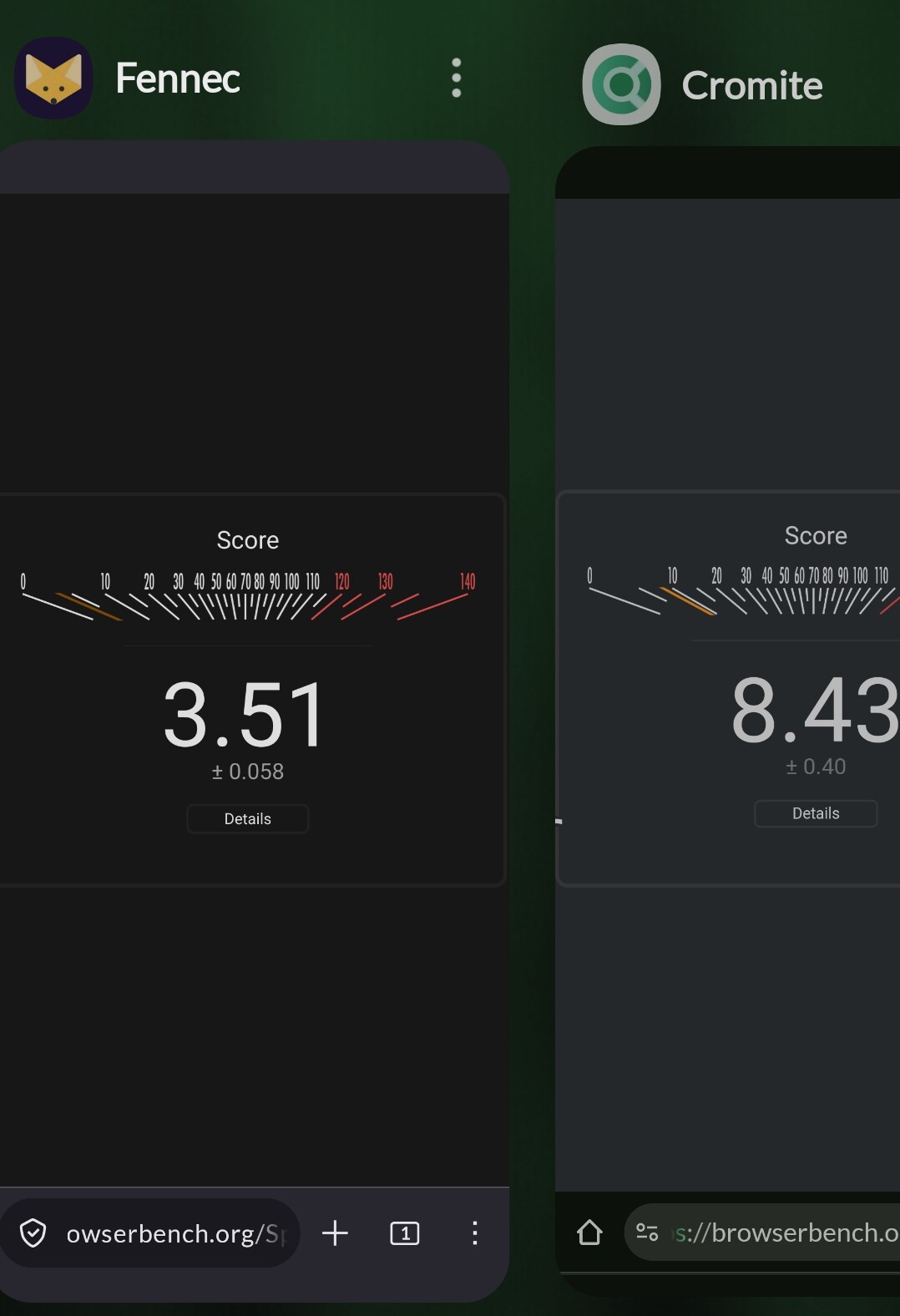 I can confirm that the official build of Firefox 144 show 15% better score in Speedometer 3.1 than Fennec 144 (357 vs 310 on my test device with Snapdragon 835 and Android 15).
