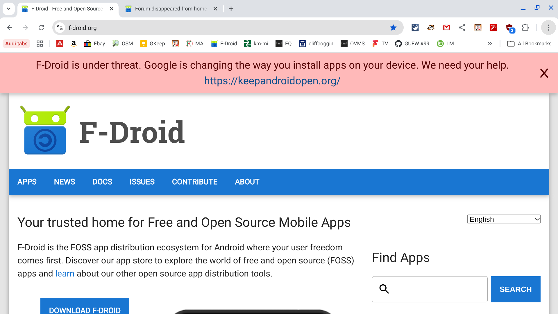 The main headings or links to this forum from F-droid home page disappeared today. Apps, News, Docs, Issues, Contribute, and About are still there, but not Forum.
