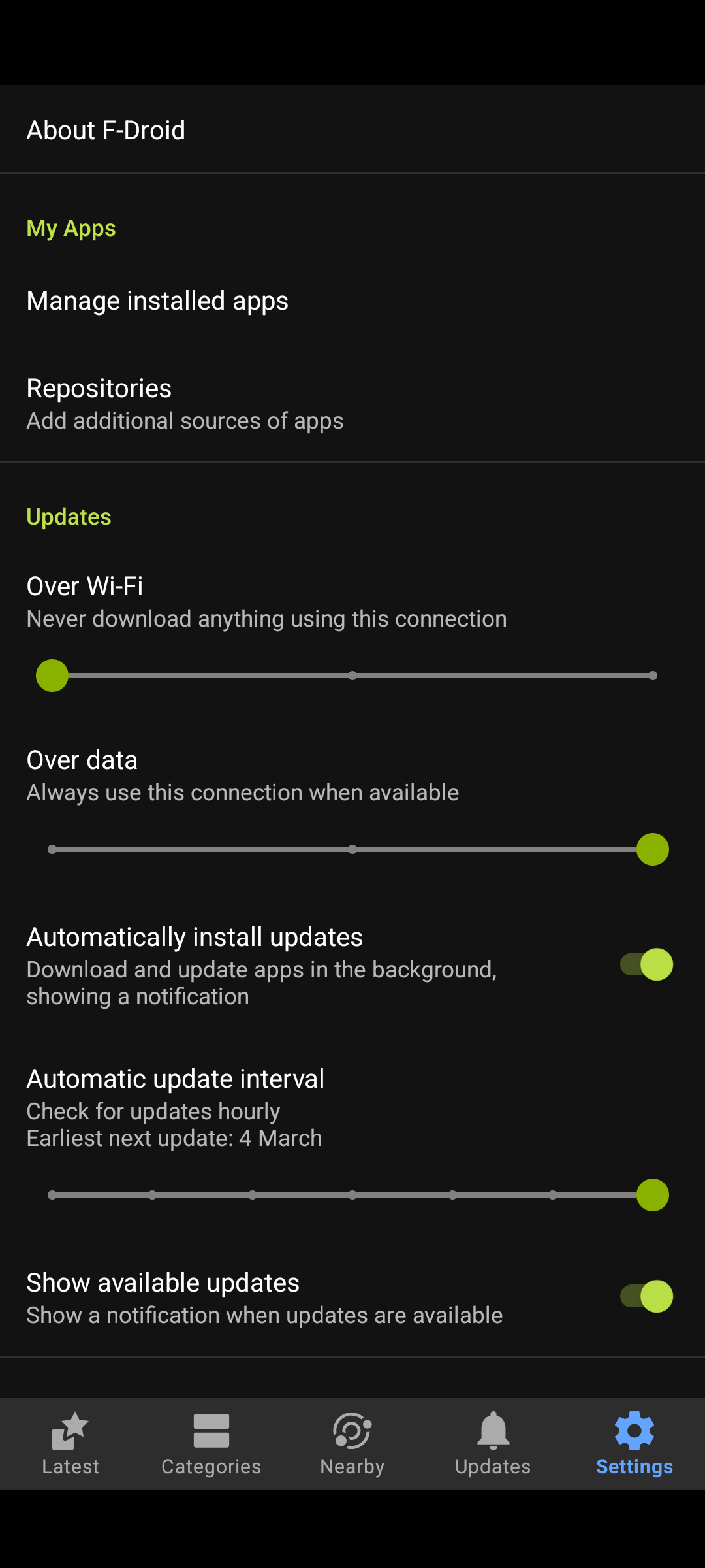 so in the F-Droid app, updates are set “Over data”, and even though it is et to Automatically install updates, the next setting states 4 March as the earliest next update. When I press updates in F-Droid app it states apps are up to date.