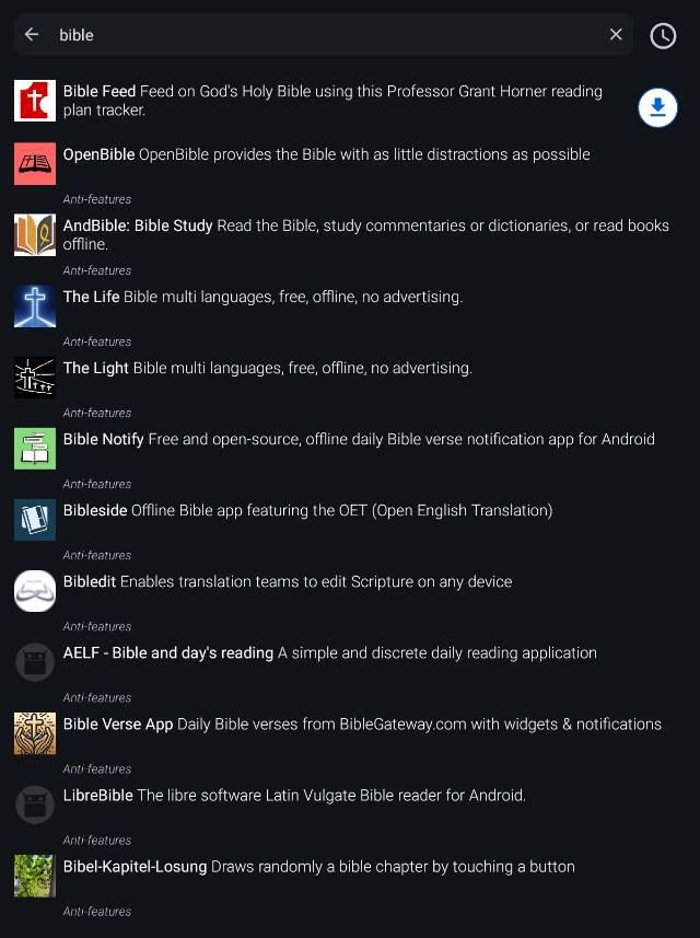 That screenshot of the army of bible apps is priceless. We should go ahead an make dozens of apps for every book tha’s out there and add all of that to F-Droid. That would not damage the reputation of a software curator whose whole security model is based on volunteers auditing its collection, oh no the NSFW tag will.