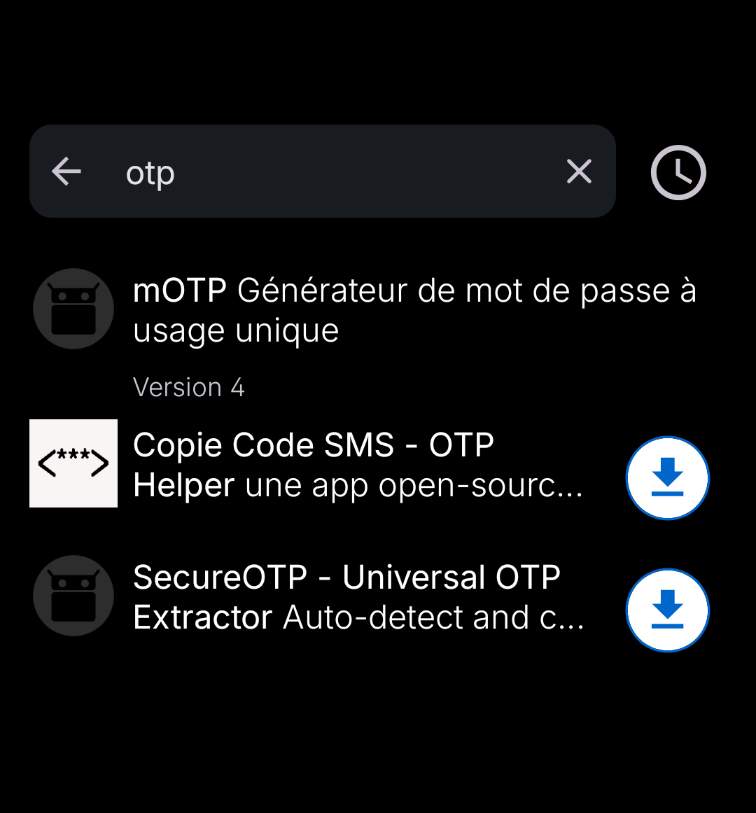 Searching F-Droid with âotpâ in my A15 lists only 3 : mOTP generator, and 2 helpers: SecureOTP and Copy SMS Code (minimum required and 2 bonus for the ones too lazzy to copy/paste).